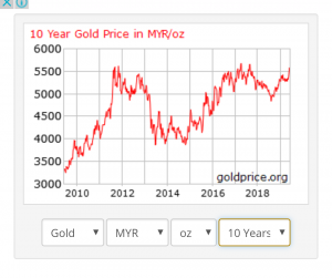 Saya pilih pula graf untuk 10-years price. Apa yang saya dapati, sekitar tahun 2012 sehingga 2015, berlaku penurunan harga emas yang agak ketara. Daripada RM5500/oz turun sehingga RM4000/oz. Penurunan RM1500/oz adalah satu amaun yang besar. Bayangkan apa terjadi kepada mereka yang melabur emas pada tahun 2012 dan melihat nilai harga emas pada tahun 2015?! Sudah tentu merasa terkejut dan tertipu. Dan jika diperhatikan lagi, sehingga hari ini (tahun 2019), harga emas baru recover kepada harga RM5500/oz tu!